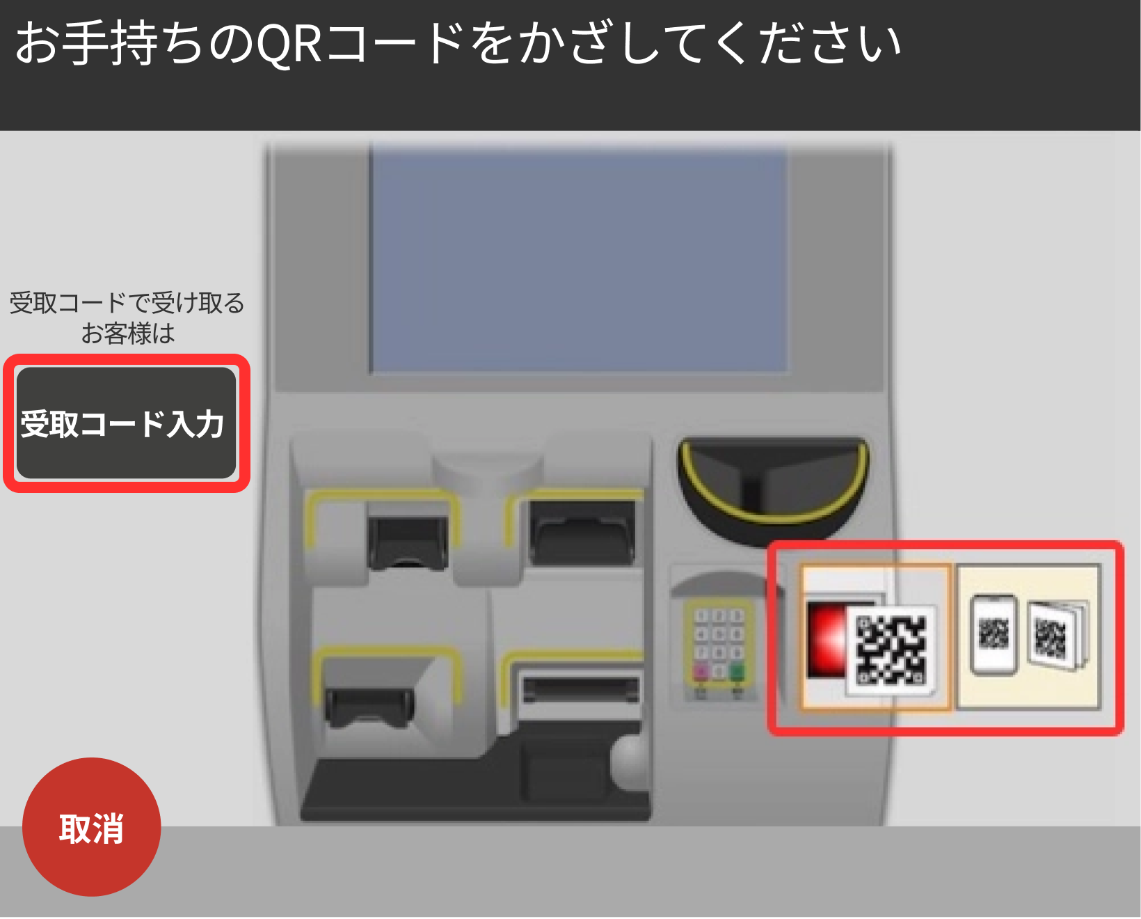 画面の案内に沿って、右下にあるカメラ読み取り部に受取用QRコードをかざしてください。